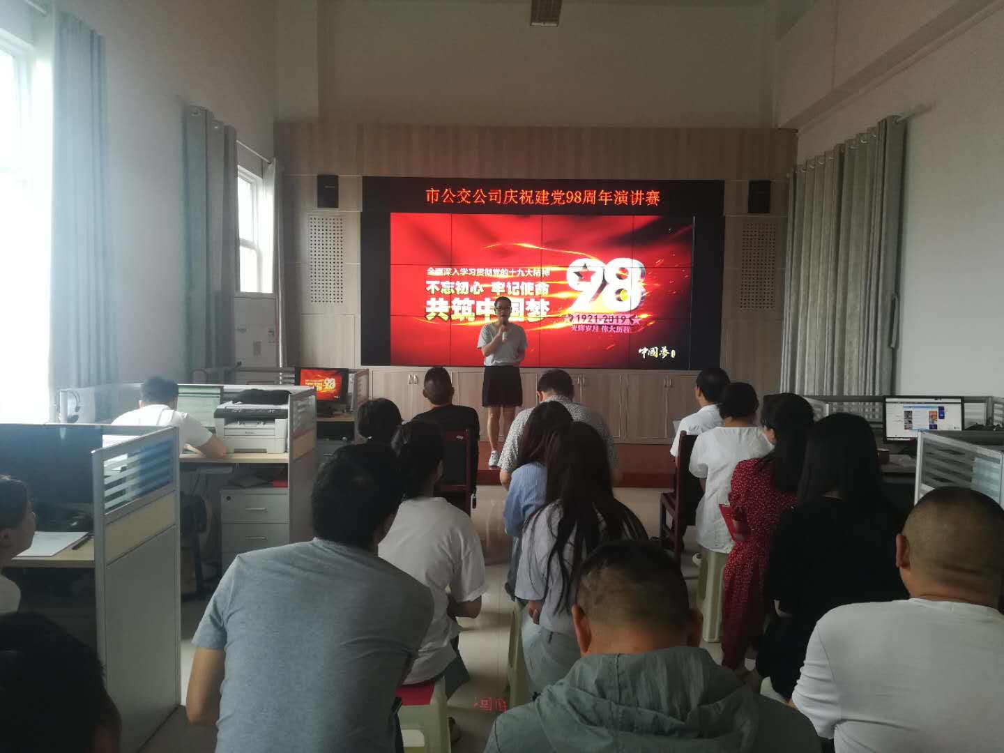 為深入學(xué)習(xí)貫徹習(xí)近平新時(shí)代中國(guó)特色社會(huì)主義思想和十九大精神,熱烈慶祝建黨98周年、建國(guó)70周年,深刻領(lǐng)會(huì)“不忘初心,牢記使命”主題教育的重大意義。6月17日上午,市公交公司舉行了慶“七一”主題演講比賽,公司黨政領(lǐng)導(dǎo)班子成員及部門科室負(fù)責(zé)人擔(dān)任此次比賽的評(píng)委,全體黨員職工參加。