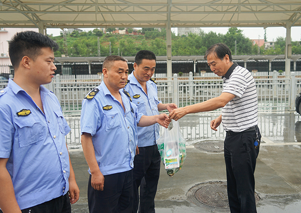 在火車站調(diào)度室,張曉強(qiáng)一行檢查當(dāng)日帶班領(lǐng)導(dǎo)、值班人員在崗在位情況,了解值班值守落實制度、工作安排和落實等情況。為駕駛員送去了毛巾、菊花茶、花露水、風(fēng)油精等降溫物品,與他們一起拉家常,詳細(xì)詢問身體情況、工作和生活現(xiàn)狀,認(rèn)真傾聽面臨的困難訴求和對當(dāng)前工作的意見建議,叮囑他們做好夏季防暑降溫、安全運(yùn)營工作。