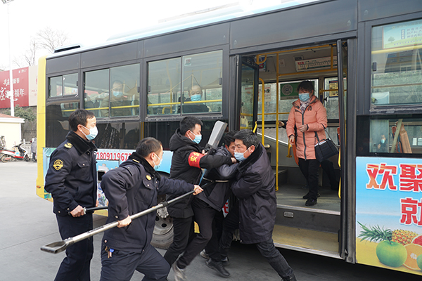 在火車站首末站,恰逢一車隊工作人員正在開展疫情防控應(yīng)急演練,一未佩戴口罩的乘客欲乘車,駕駛員制止后,該乘客非但不聽,強行上車后辱罵、持刀相向駕駛員,駕駛員隨即將情況報告車隊長并報警,車隊安保人員將其制服??赐暄菥毢?,熊衛(wèi)軍、錢萬輝對工作人員面對突發(fā)事件的應(yīng)急處置能力點贊。